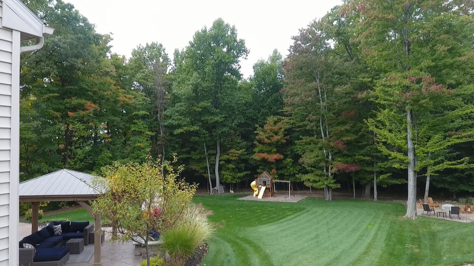 The backyard abuts a 2.17-acre wooded common area parcel owned by the HOA, providing privacy and a verdant backdrop.