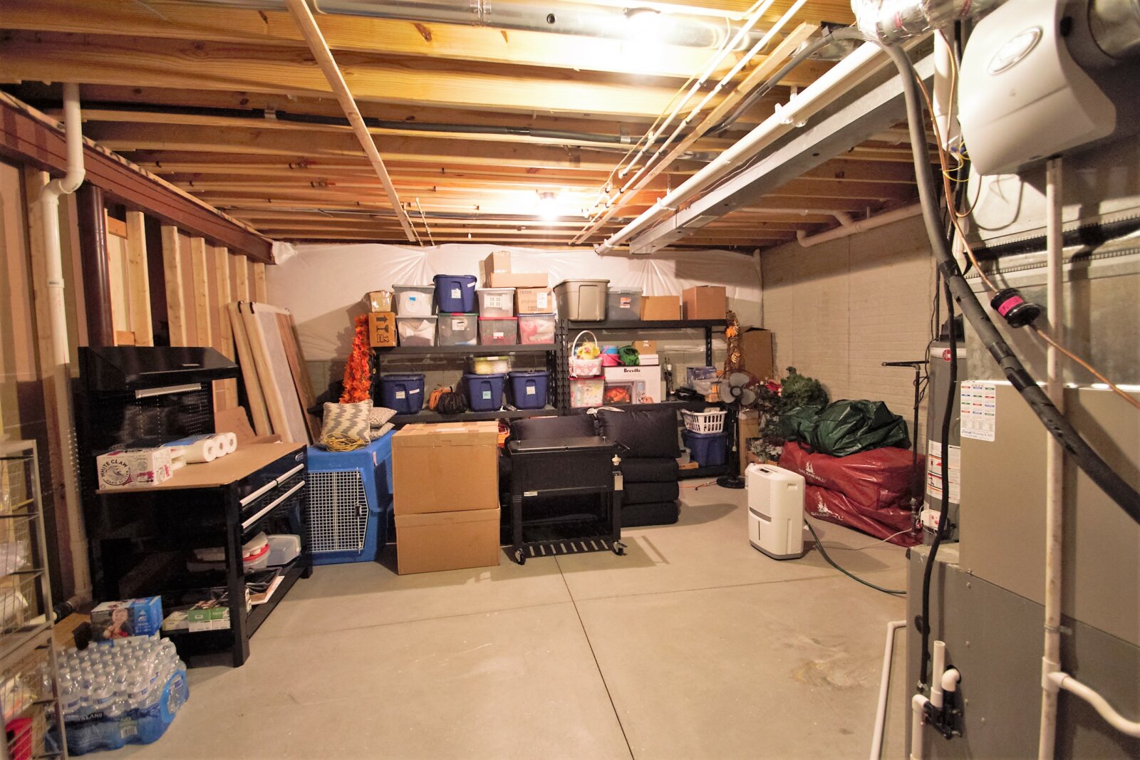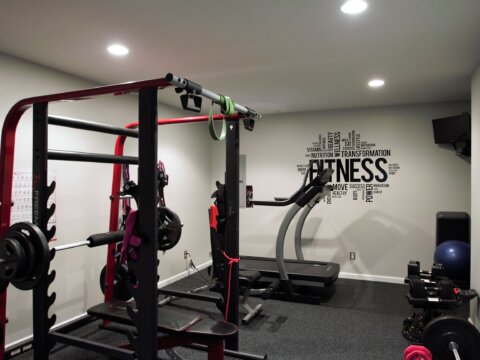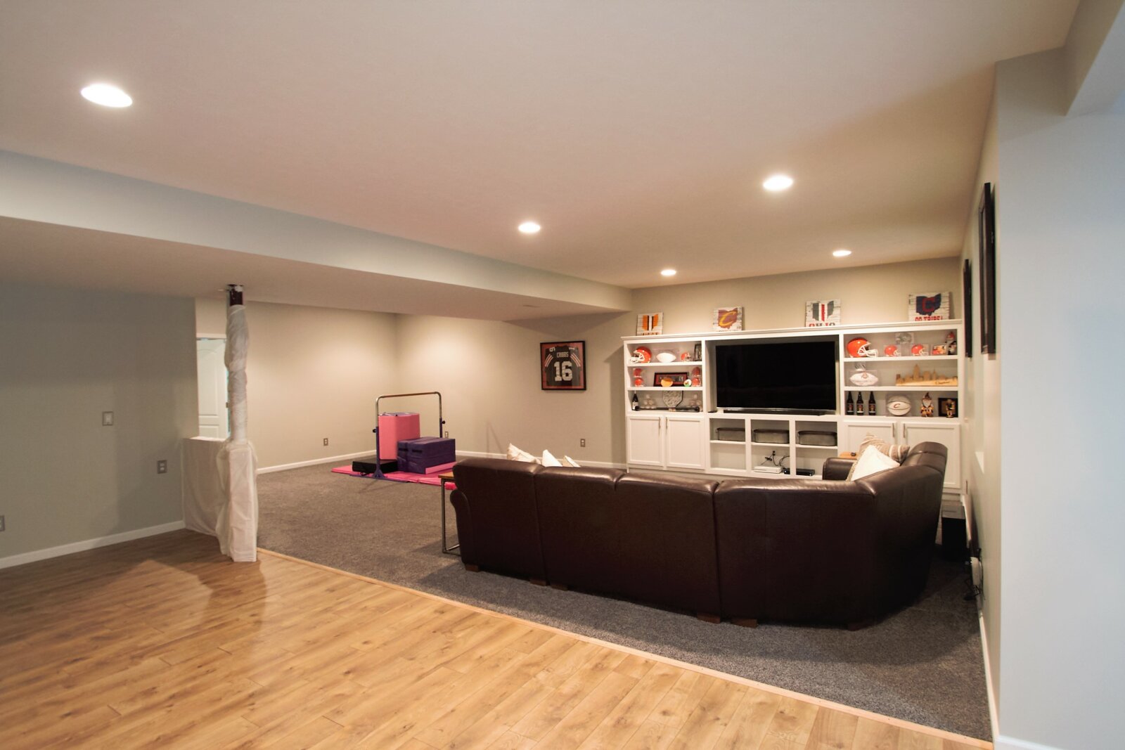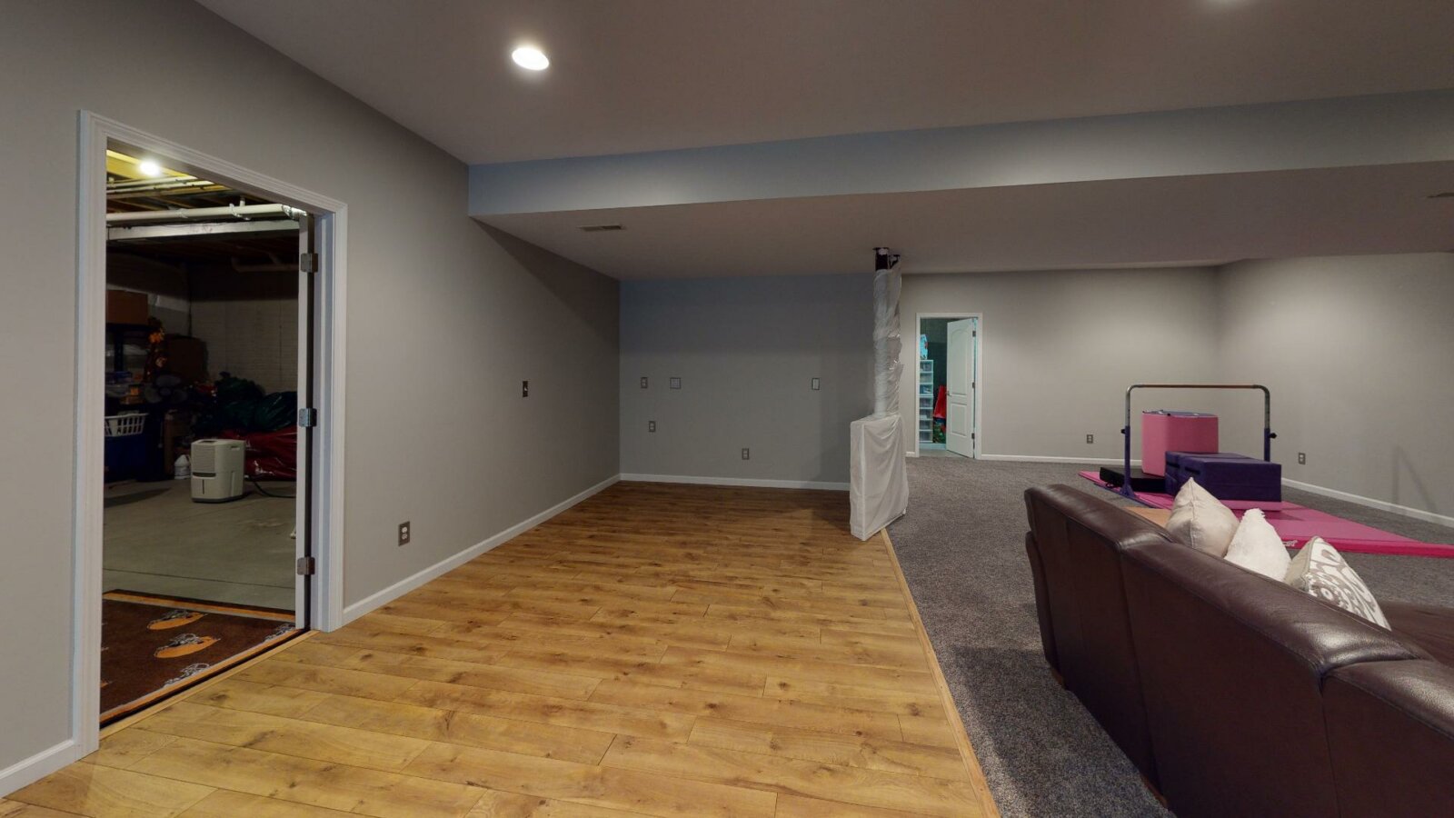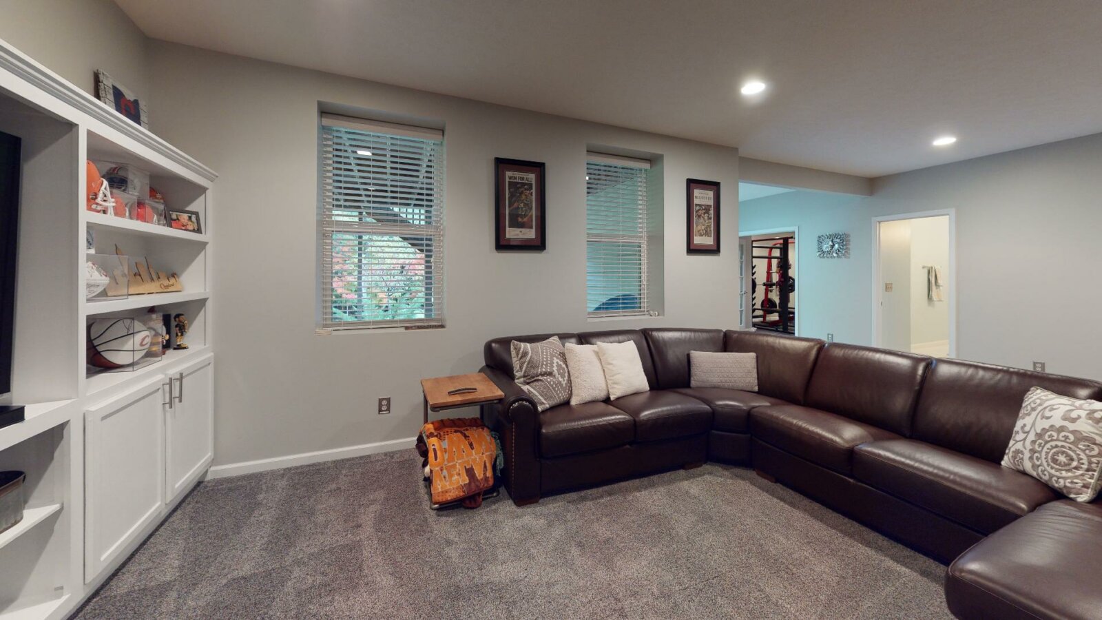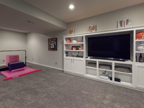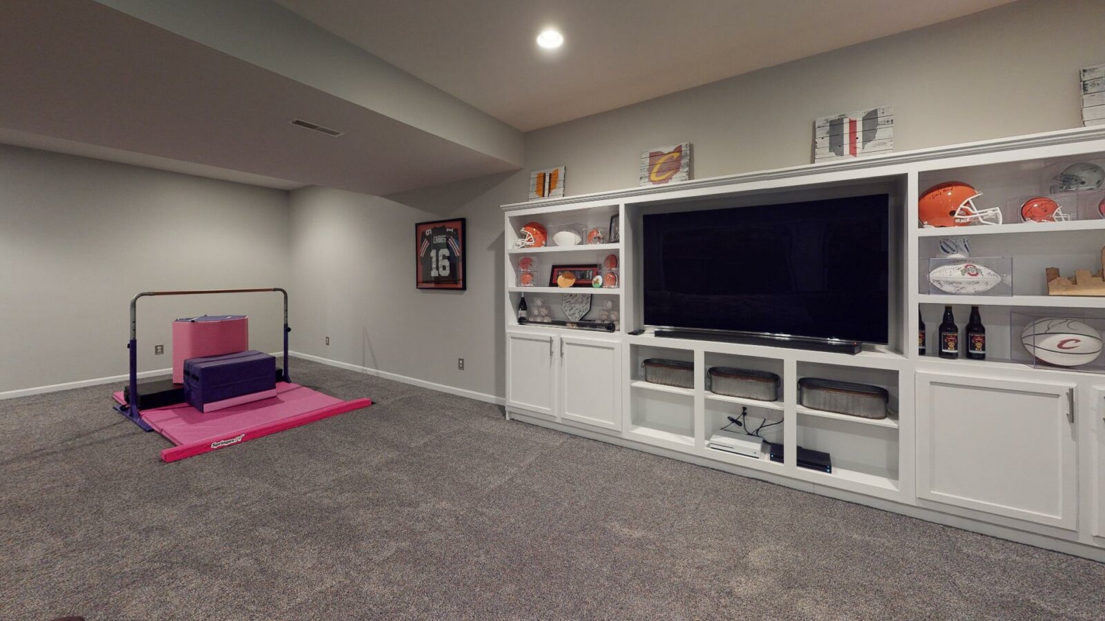 The walkout basement includes plenty of storage space, a beautiful full bath, a private home gym with padded floor, and a large entertainment space with built-ins, a carpeted section, and an area with LVP and roughed-in plumbing for a future wet bar.