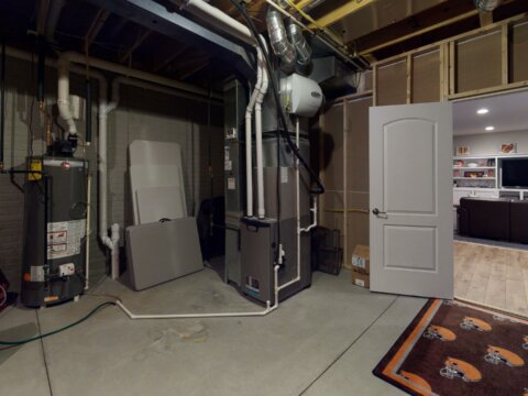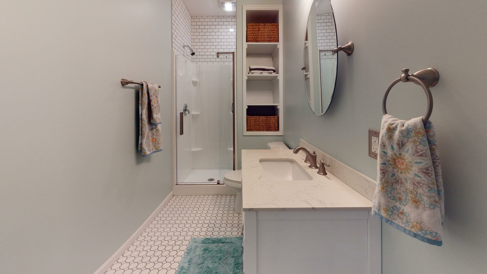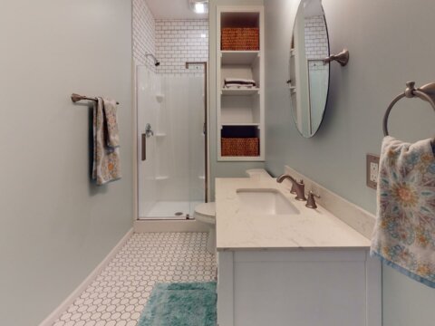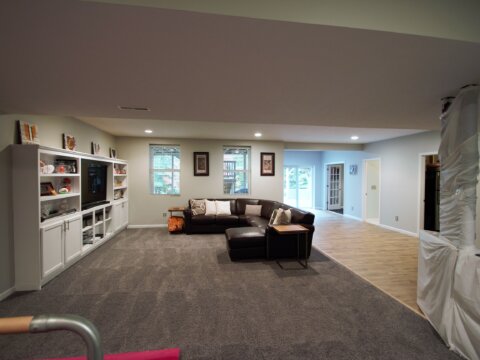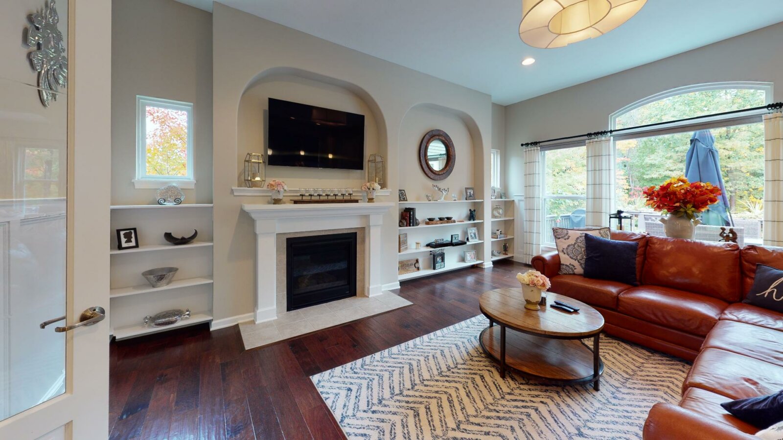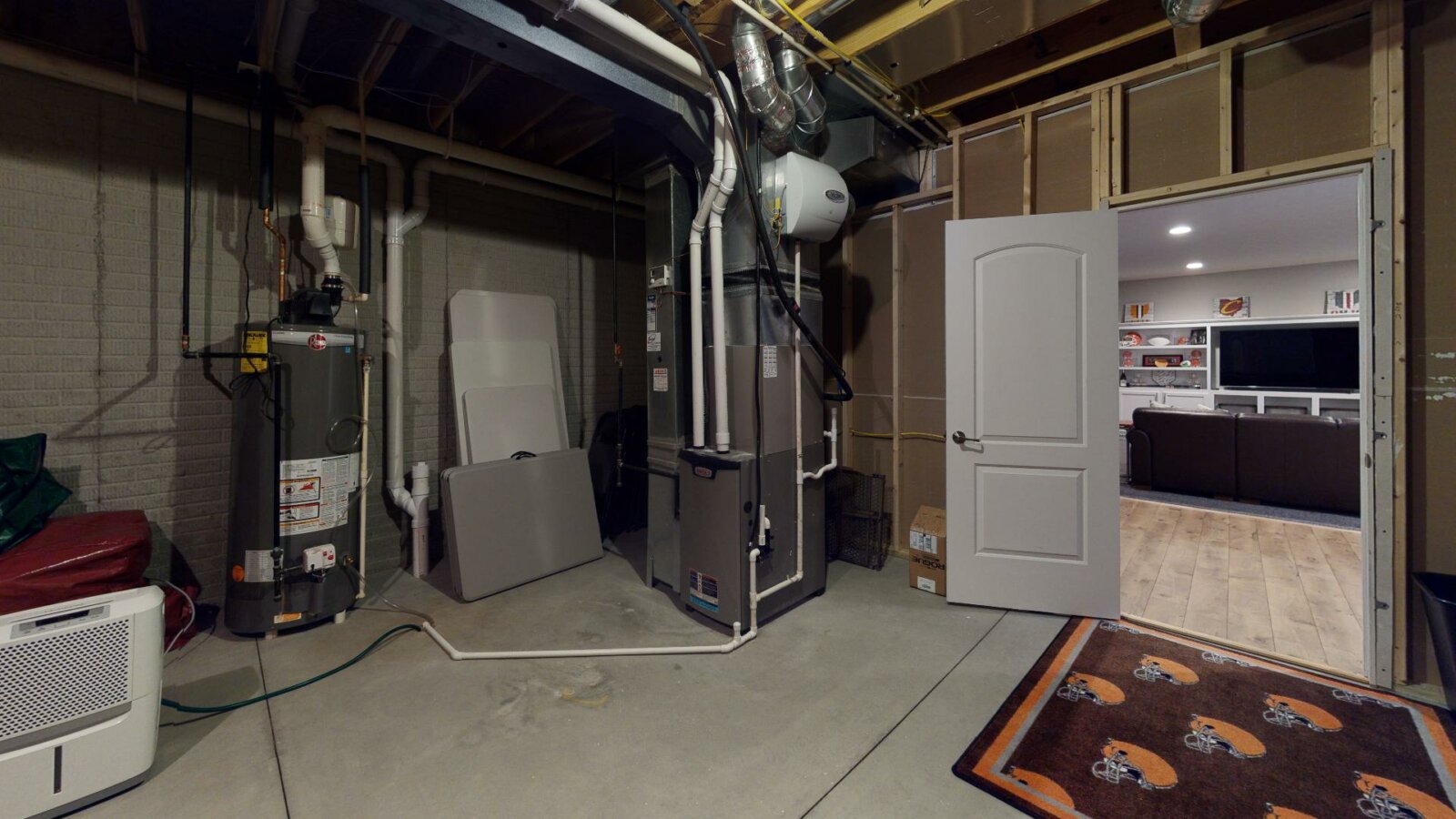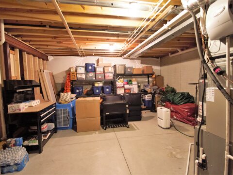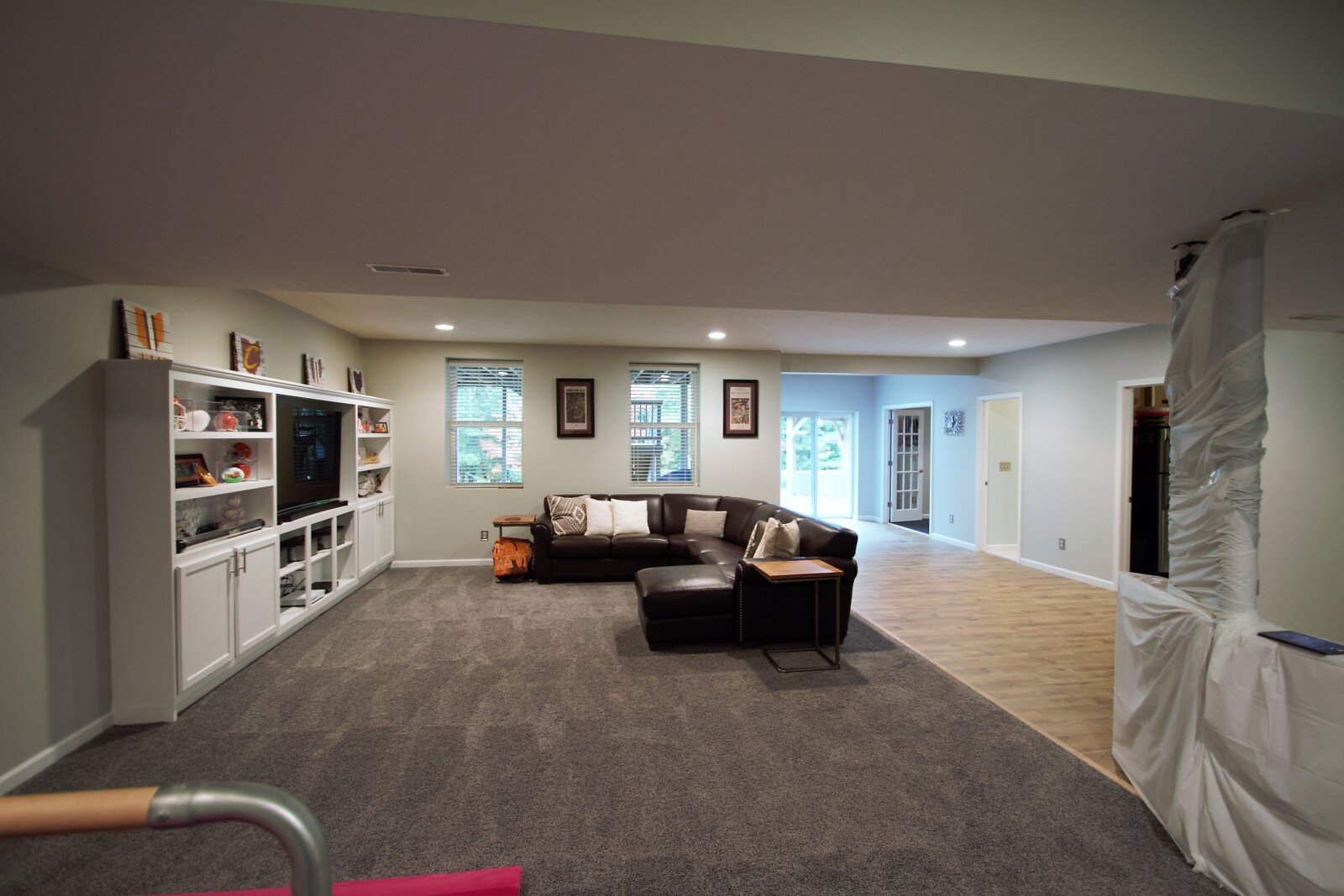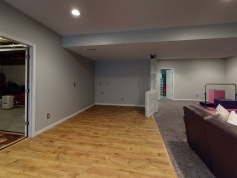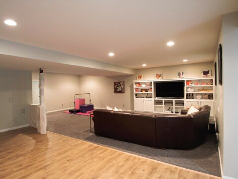 The walkout basement includes plenty of storage space, a beautiful full bath, a private home gym with padded floor, and a large entertainment space with built-ins, a carpeted section, and an area with LVP and roughed-in plumbing for a future wet bar.