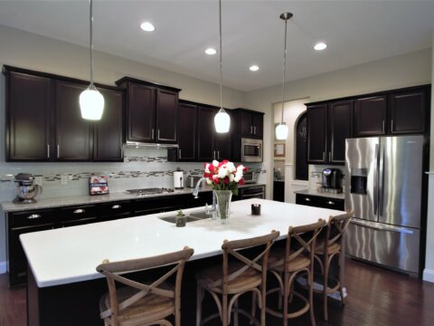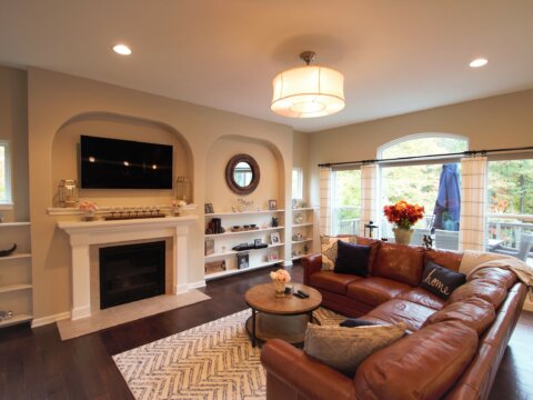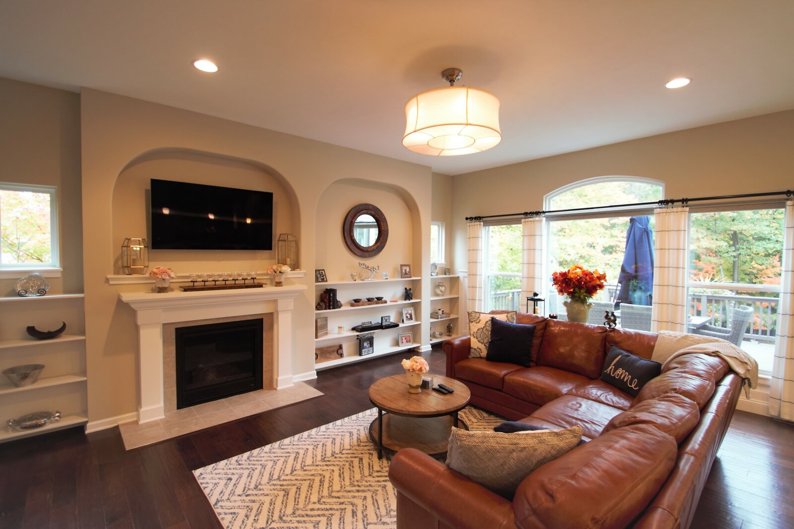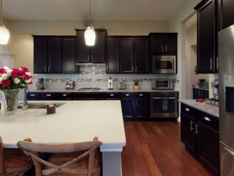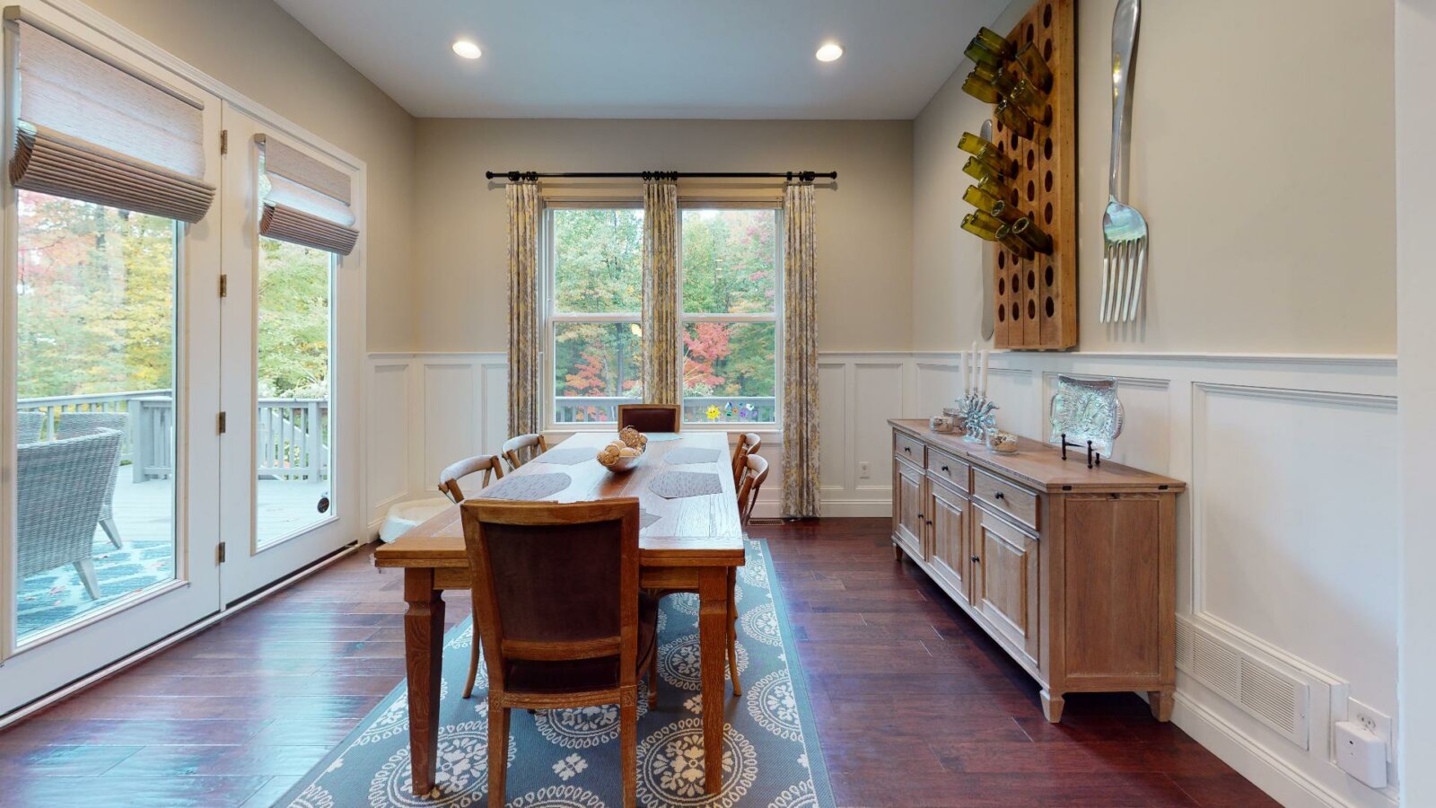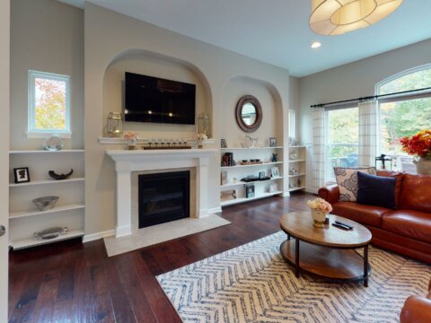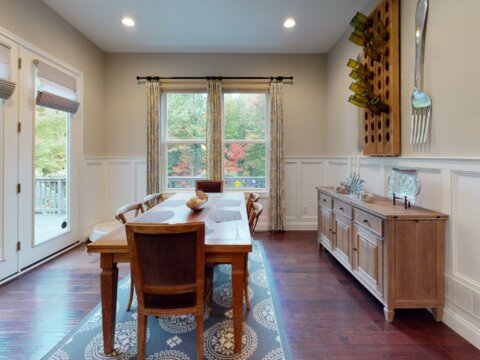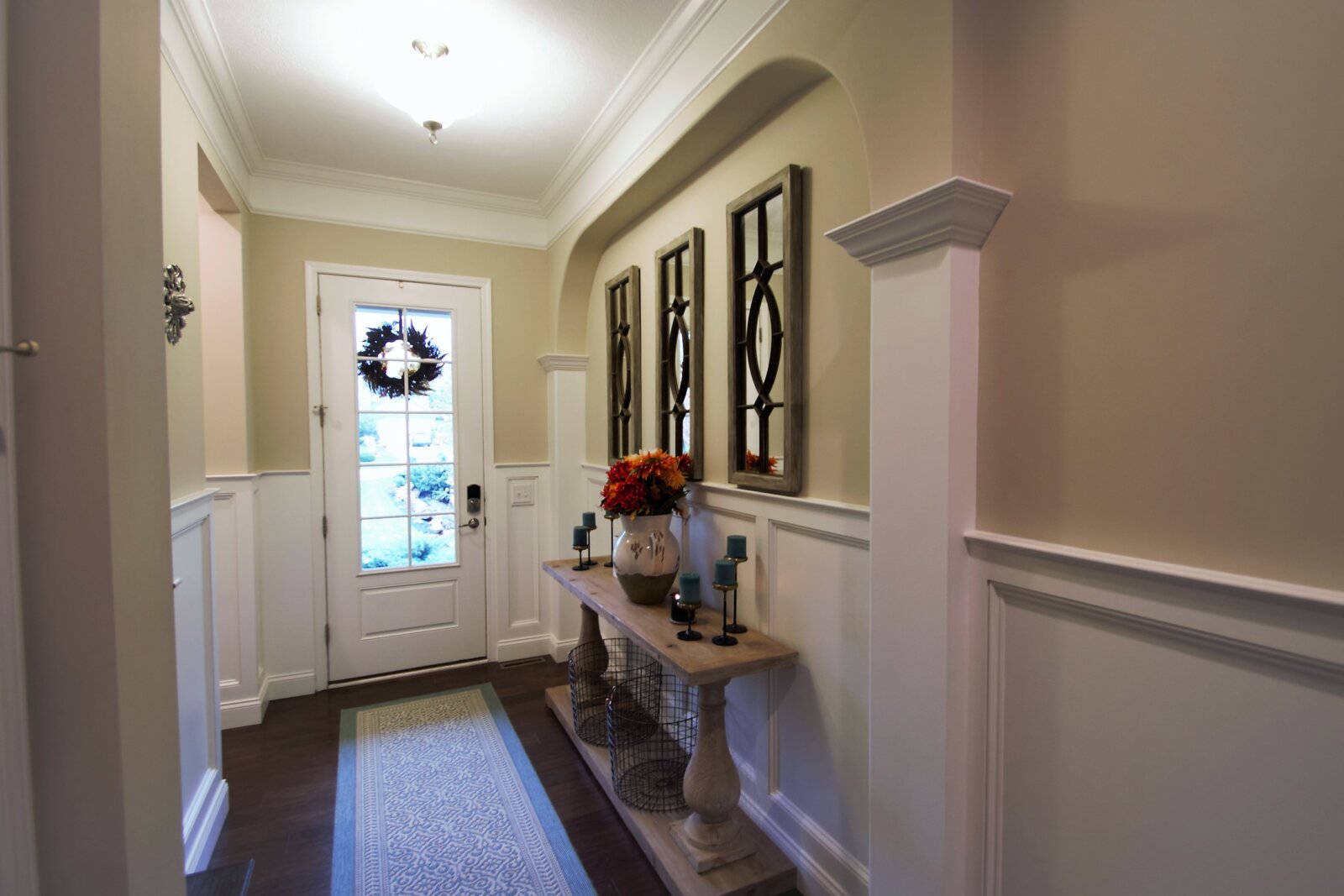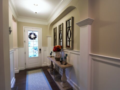 Ornamenting the foyer are wainscoting, arched alcoves, and hand-scraped hardwood floors that extend throughout the main living areas.