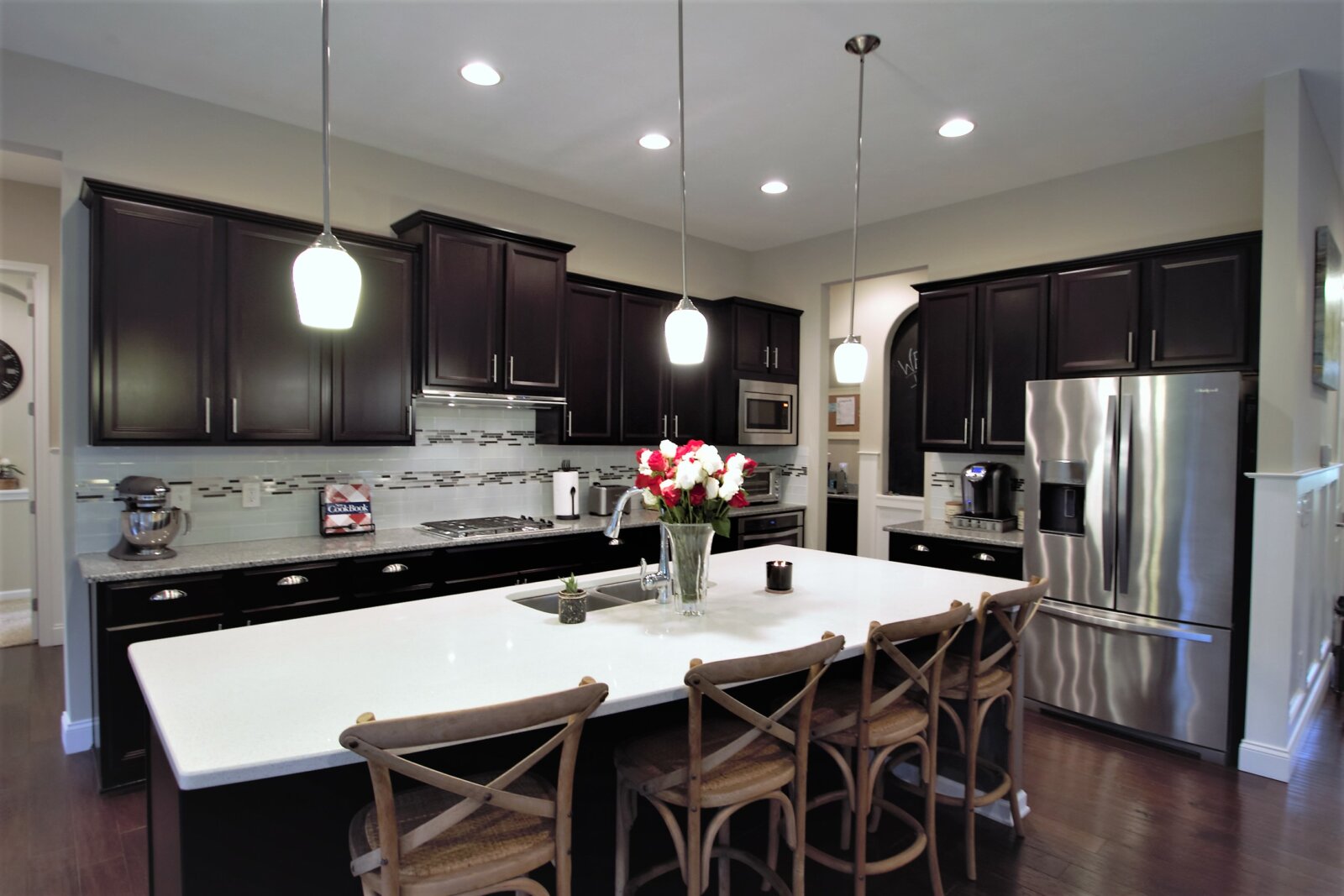 Ten-foot-high ceilings grace the first floor, which includes a private den with french doors; an open great room with carpeting, a wall of windows, gas fireplace, and curved recessed alcoves with shelving; and a spacious kitchen boasting abundant cabinets, granite and quartz counters, SS appliances, a breakfast bar with pendant lighting and room for four seats, and morning room/dinette area with access to the elevated deck.