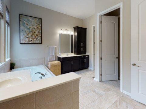 The first floor owner’s suite is enhanced by a chandeliered double tray ceiling, access to the elevated deck, and private bath with dual vanities, a sizeable doorless walk-in shower, a soaking tub, enclosed commode, and a custom-shelved walk-in closet.